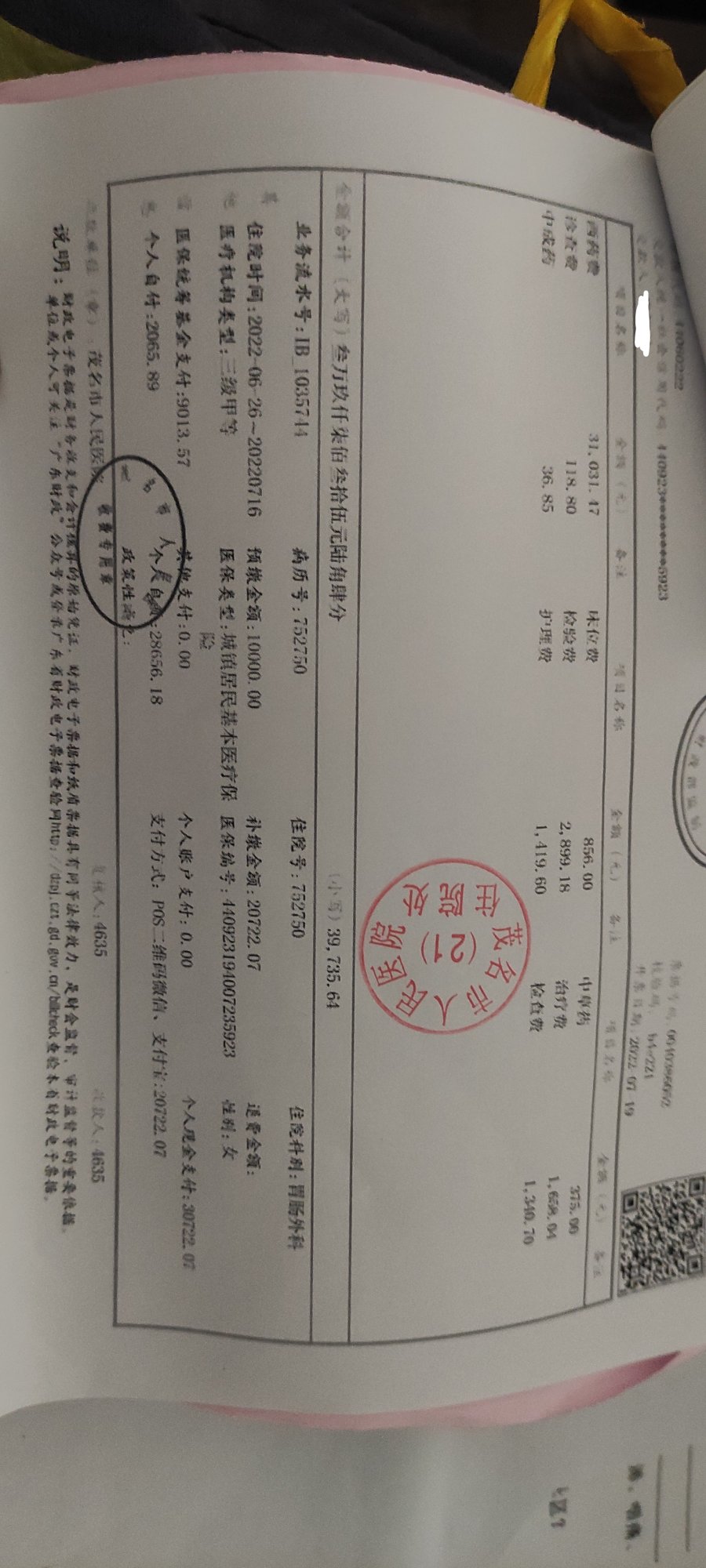 茂名市三甲医院,按实际能报销的范围的50%报销比例。没报销的话,估计就是自付部分那个几万×2=10几万。对吧。荷包更加受伤吧。