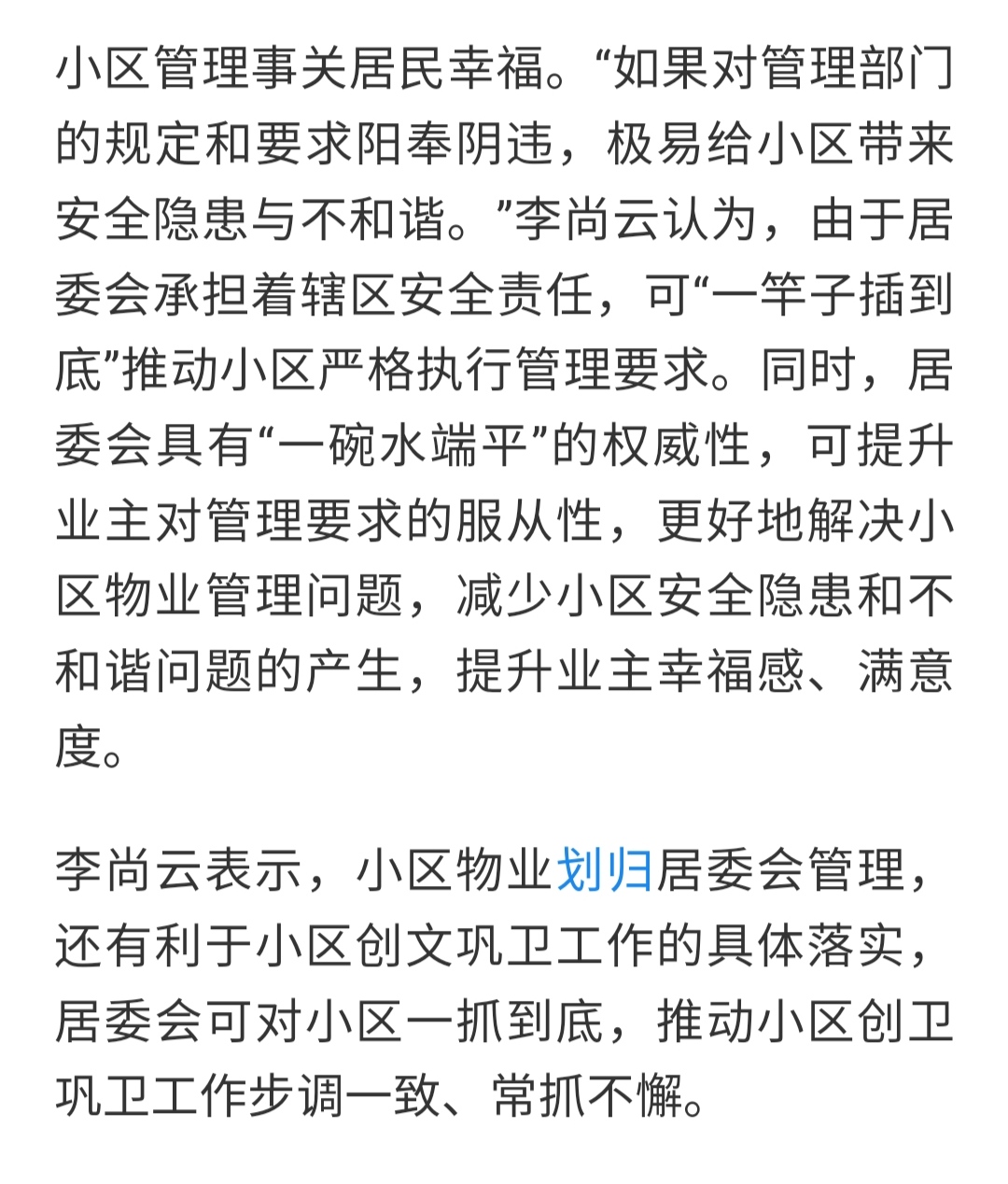 这种代表居心叵测! 现实情况下,小区居民没有对居委会主任的投票决定权,全由上级领导任免。 就只会对上级领导负责效忠,不可能出现对居民“一心一意、一抓到底”的情况 当上了人大代表的年纪、阅历,不可能不明白这里面的利益牵涉 他提出这种方案,就是不顾现实情况,曲意迎合上级的需求。