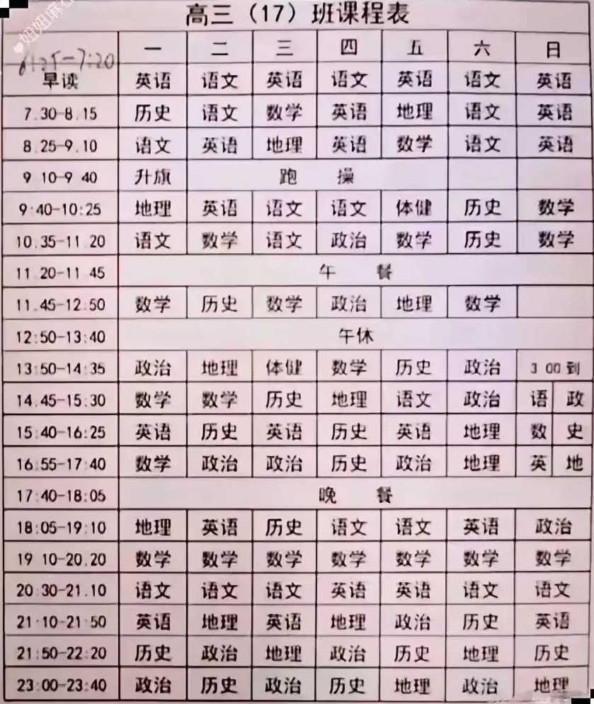 学生也拼啊,以前的时候高三都是一个月连轴转,30天几乎每天学习和作息时间都是一样的没有周末的概念。只有星期日下午可以多睡一个钟头。平时是下午两点20分到教室,星期日是下午三点到教室。也就是说这不算放松休闲的时间而是睡觉的时间,30天每天都一样的。真正可以自由掌握的就只有中午12点到中午1点之间。作息学习时间是6点起床,6点半到教室,十二点下课,一点钟午睡,下午两点起床,2点20分上课。 下午五点下课,五点半做完练习吃晚饭加洗澡一个小时。六点半到教室。晚上10点半下自修。11点休息。相当忙碌紧凑,节奏很快。每天学习时间很长。 8节课40分钟一节,一个小时早读早练,四个小时的晚读晚练和自修。一天足足10个小时。如果善于利用时间,可能达到11小时。