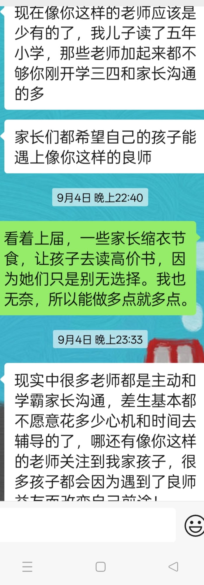 老坛酸菜黑不了我的。互联网上,很多人间我难题,讨论教育,我都直面帮忙。三台手机记录下我的所有努力。电白这块地方,平时我帮忙的,也不计其数。上课归上课,我也是唯一敢切半只鸡或买块讫(错别字),课余或体育课,一起开开心心地吃。