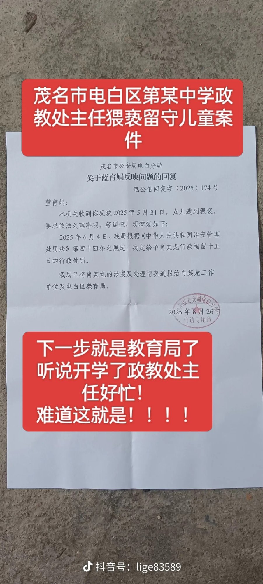 电白教师同盟会 教授 注册 2009-11-04 消息 2,589 反馈评分 188 点数 101 2025-09-07 Android Chrome Mobile 122.0.6261.119 #11 老坛酸菜 说: 都是在试探边沿,看你不敢反抗就是得寸进尺,就差得手和未遂。严厉打击才行,不能给教师队伍丢人。 点击展开... 这种禽兽不如的人,严重违反了职业道德,教育局为什么不处理?(警告、记过、降低岗位等级、撤职直至开除)