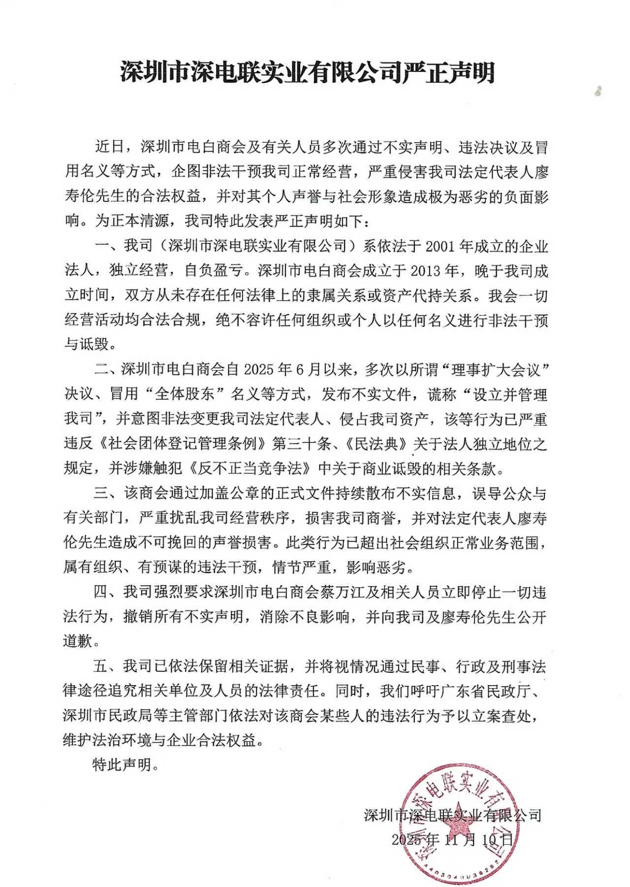 我们呼吁全体在深电白乡亲,明辨是非,认清个别窃据商会职务者“满口公益、实则私心”的真面目。我们坚信,法律的正义之光必将驱散一切试图侵吞集体资产的阴霾。任何狡辩与污蔑,都无法阻挡我们依法维护自身合法权益的坚定步伐!