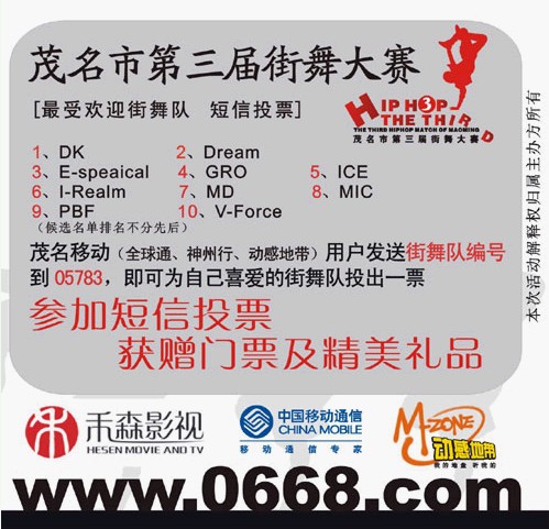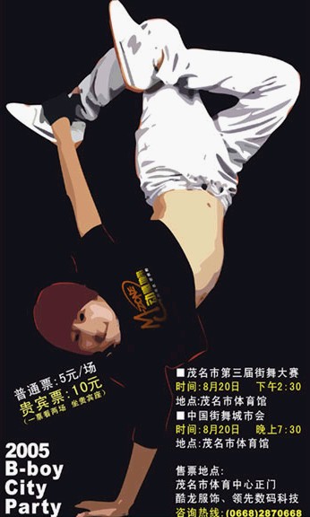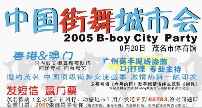 P PBF咩仔 研究生 注册 2004-10-27 消息 1,059 反馈评分 0 点数 61 2005-08-11 #1 茂名市第三届街舞大赛 8月20日 下午2:30 茂名市体育馆 中国街舞城市会 8月20日 晚上 7:30 茂名市体育馆 . 普通票:5元/场 贵宾票:10元(一票看两场并坐贵宾座) 售票地点:茂名市体育中心正门 酷龙服饰 领先数码科技 大赛热线:0668--2870668 附件 01...jpg 99.1 KB · 查看: 315 03...jpg 79.9 KB · 查看: 290 02.jpg 46.2 KB · 查看: 316