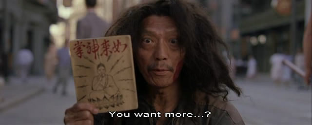 他在《功夫》里改卖如来神掌拳谱了,见到小周星驰说:“哇,不得了啊不得了,你有道灵光从天灵盖喷出来,你知道嘛,年纪轻轻的就有一身横练的筋骨,简直百年一见的练武奇才啊,如果有一天让你打通任督二脉,你还不飞龙上天,正所谓我不入地狱,谁入地狱……警恶惩奸,维护世界和平这个任务就交给你了,好嘛?”