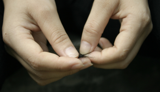陈清华的妹妹陈小清用手捏着自己刚刚脱落的头发。