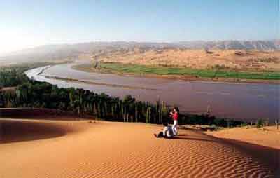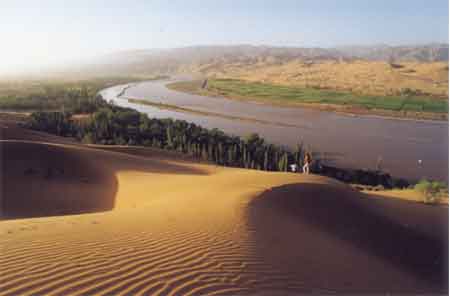 古老的黄河野马般地奔腾着穿山越谷,经黑山峡一个急转弯流入宁夏的中卫境内。这一个急转弯,使黄河一改往日的汹涌成为文静秀美的少女,平静缓流,滋润两岸沃土;这一个急转弯,造就了一个神奇的自然景观―――沙坡头。