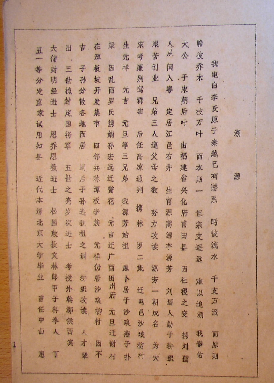 李佑太公于宋朝后叶由福建省兴化府莆田县,因社稷之变,携刘孺人从闽入粤定居江邑古井生育源蒿、源芋、源芳,源芳为宋孝廉别驾郡宰,后任高凉通判。现寻查李佑在广东省的世系和在福建莆田的世系资料。