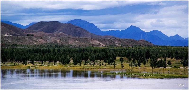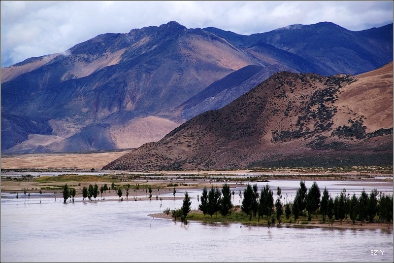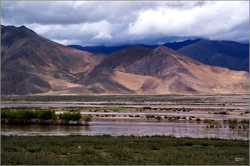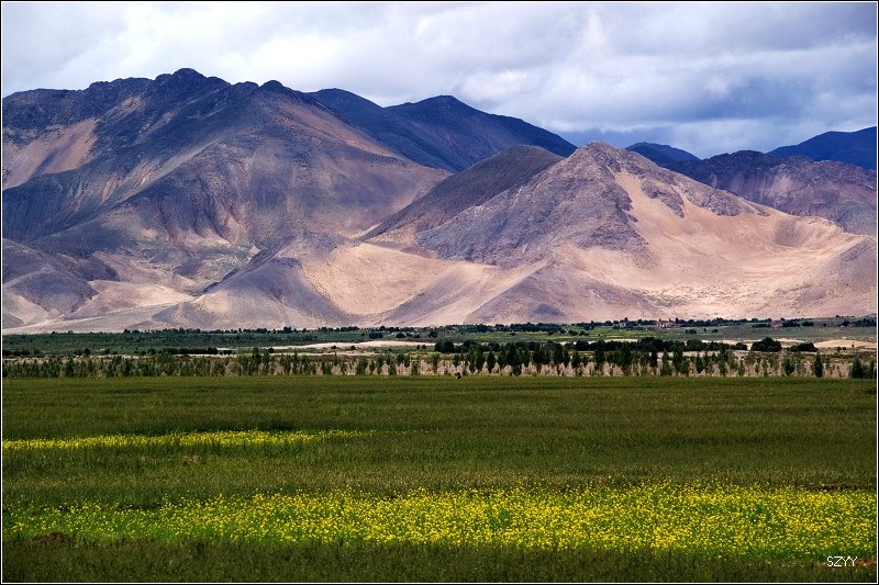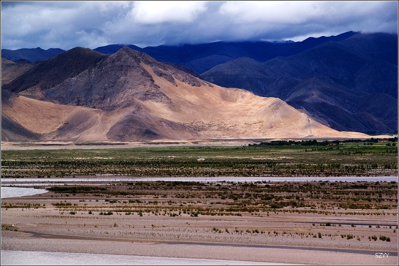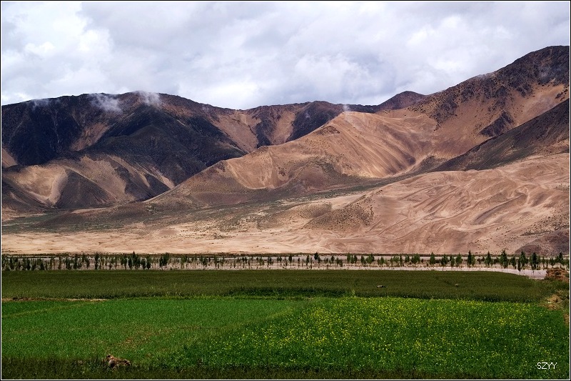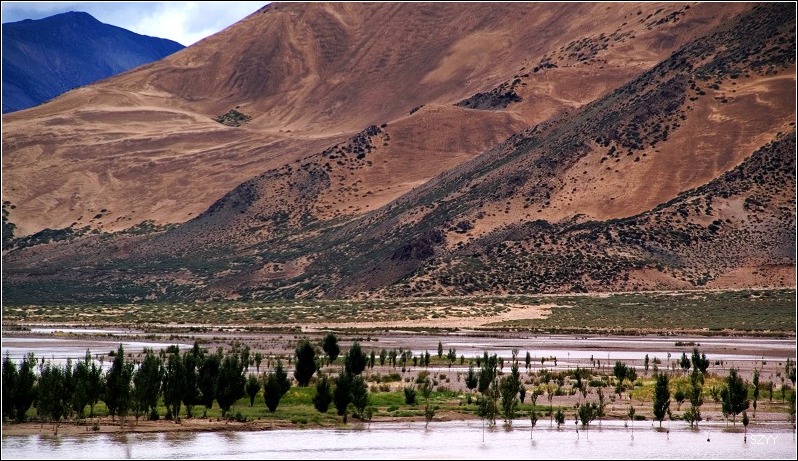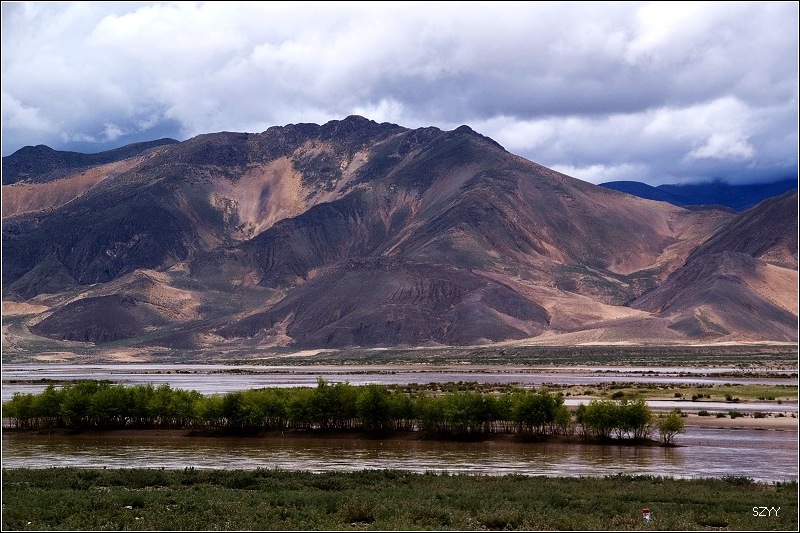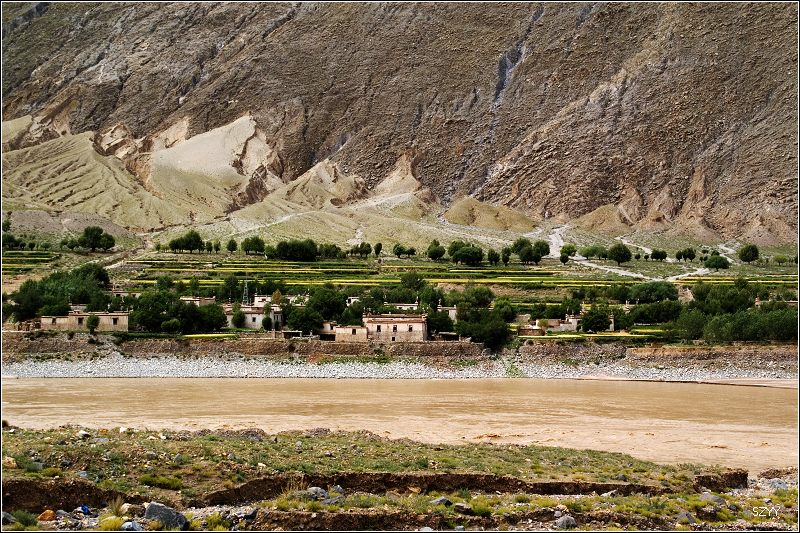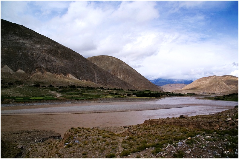 从拉萨到日喀则跟林芝到拉萨相比,景色有天壤之别,林芝到拉萨,一路植被茂密,景色优美,高山深谷交替,落差巨大,往往达几千米。植被垂直分布十分明显,从热带到寒带的植物都能见到,从下到上,分布着热带雨林到温带阔叶林、混交林、针叶林、灌木林、高山草甸、苔藓直到什么也不长的雪线以上,一座座雪山。而拉萨到日喀则则是植物稀少,甚至满眼望过去,看不到一棵植物,起伏不大,但都是在高原山地行车,如果没有雅鲁藏布江相伴,看着跟在火星上一样,石头都是红色的,十分单调,感觉是不适合人居住的地方。可惜这些荒凉的地方没拍照片,后面遇到有了绿色才拍了几张照片.