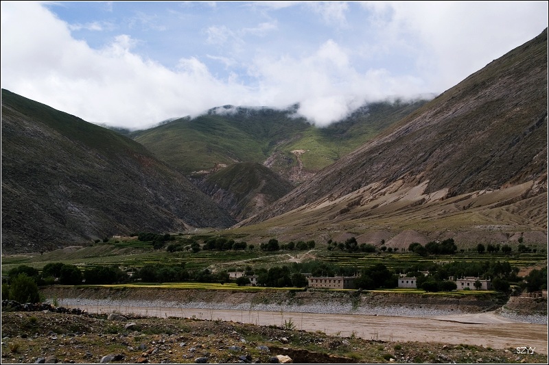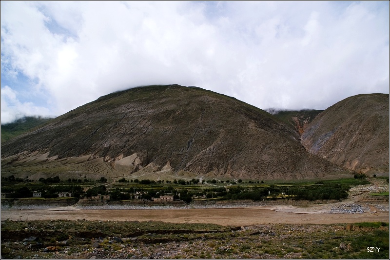 我们继续前进,开始下山,下山后路过几个小村子,有几个地方有泥石流横在路上,好在规模不大,我们都开了过去。到了一个岔路口,没有任何标志,正好有几个藏民,问路也听不懂,只有“仁布”两个子发音基本一致,他们举手示意仁布的方向,我们顺利走上正确的路,5点到达仁布,并入G318,用了3个多小时。早知道这条路这么难走,也许当初我们会返回日喀则走318国道了。不过走这条路的新鲜感和路上的复杂心理感受就不会有了。