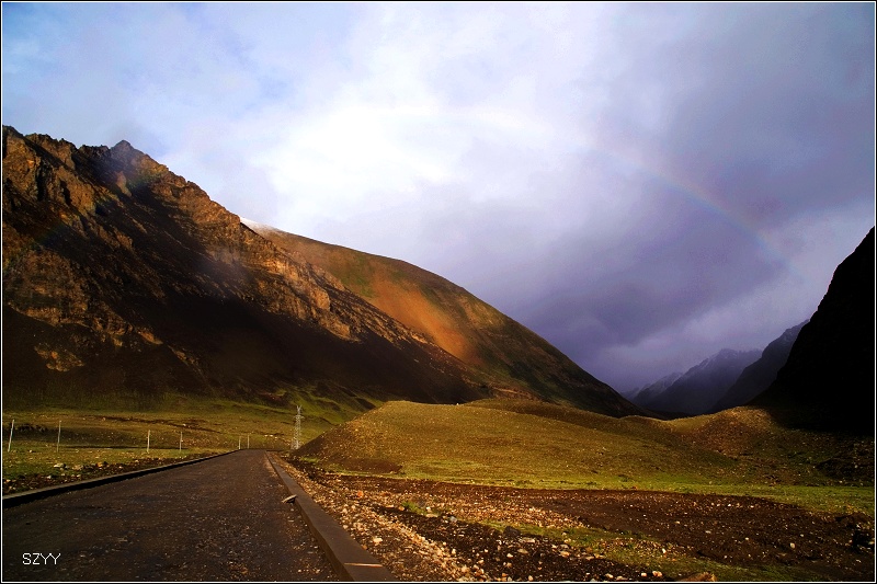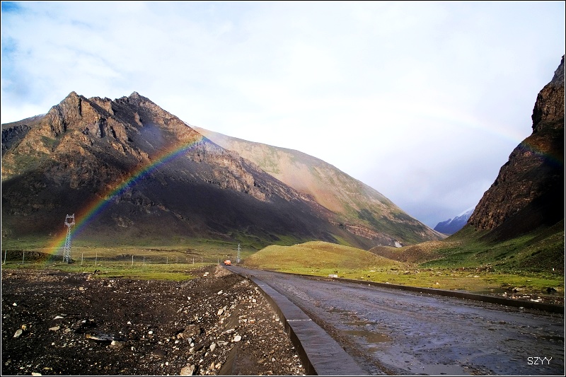 由于正在修路,有一段只好走路基以下了。走了一段才回到砂石路面。原野上到处开着野花,早晨的阳光斜斜地射在地面,一个红色的帐篷支在那里非常鲜艳夺目,帐篷外有两辆山地自行车,显然是骑单车走西藏的旅行者,他们还没起床。远处的雪山露出头,不一会儿看到一处冰川,离的非常近,可惜有一条小河,虽然不宽,但是河水湍急,没法过去,否则我们真要跟冰川进行亲密接触了,只好拍了些照片,这是正好有当地人骑摩托车经过,我们赶紧问他,这是不是卡惹拉冰川,他点头说是。这时下着雨,同时又出太阳,天空还出了一道彩虹,广角不够,很难拍全彩虹。拍完卡惹拉冰川,我们掉头往羊卓雍措,天气越来越好,真是难得,我们这一路大部分时间下雨,看着天气变晴,我们很高兴。