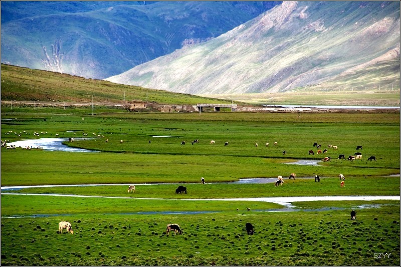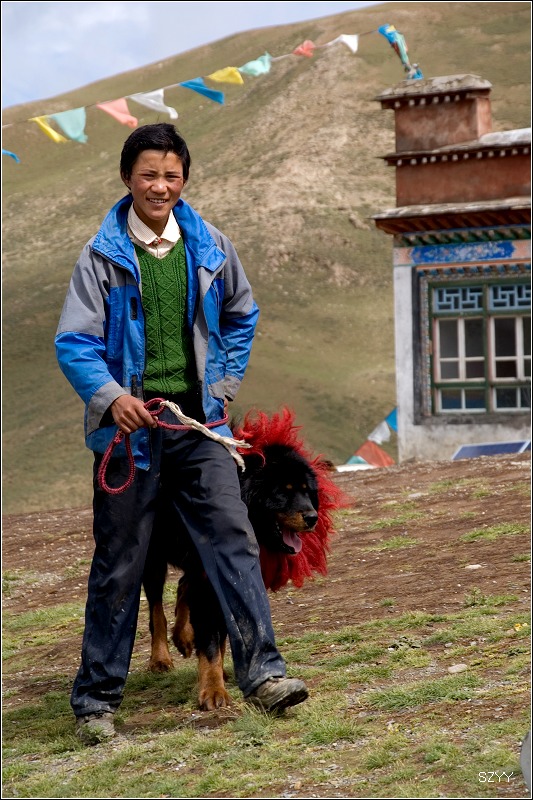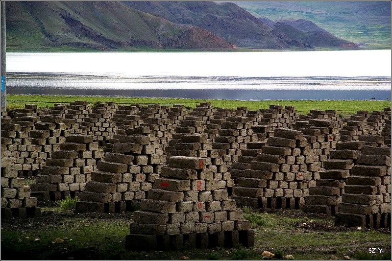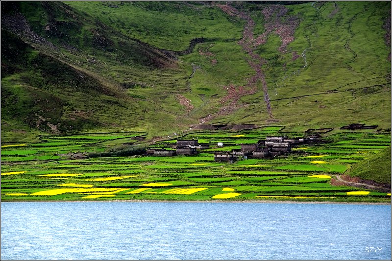 到了羊湖,我们很开心地拍照,抬头看看岗巴拉山口,我不由吃了一惊,山口上停满了旅游大巴,无数个游客密密麻麻像蚂蚁一样,站满了山口,不过他们只能在那一个固定角度欣赏羊湖,我们把车拐到一家孤零零的藏族房子前面,这个房子我们已经在无数个网上的照片里看到过了。我们刚停下来,就有三个藏族的小孩子围了过来,我们从车里拿出图书分给他们,他们的哥哥也走了过来,领了一只巨大的黑色藏獒让我们拍照,拍一张5块钱,够贵的,我们没拍,我问他这藏獒有多大了,他说已经9个月大了,我是第一次见到这么大的狗,头大的跟狮子似的。我问他这房子是不是他家的,他说是,这房子要十几万。有很多藏族人非常有钱。我们拍了一些羊湖的照片,这个角度跟团旅行肯定是拍不到的。