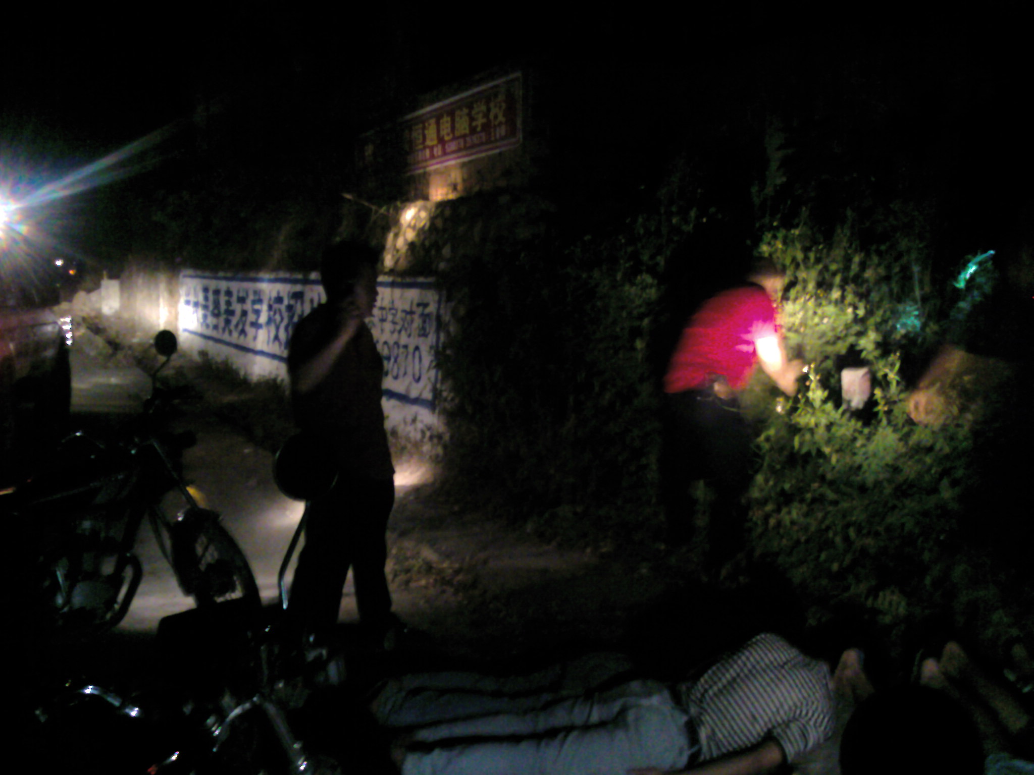 昨晚半夜一点多钟在水东喝完酒骑摩托车回家,来到陈村戒毒所路口时发现路上停了好几部摩托车,有几个人用几支手枪顶着几个男青年趴在地上,吓我一跳,开始我以为是抢劫,原来是陈村派出所的公安抓了六个抢劫犯正捆绑在地上,缴获了几把开山刀,一个公安在附近的草丛里寻找着什么,陈村派出所的公安真厉害,四个人抓了六个人,要不是他们抓了这帮人渣,可能被抢的就是我了,这等新闻怎么能错过,我连忙用手机拍了下来跟大家分享。