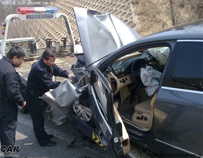 迈腾的发动机仓溃缩成功,A柱没有变形,气囊悉数弹开