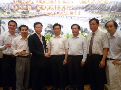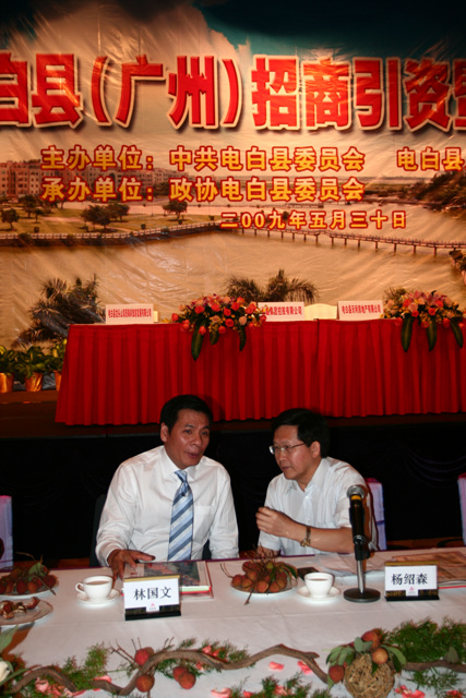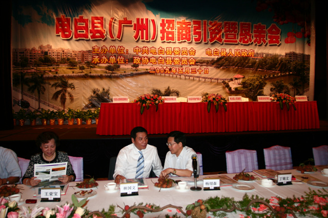 热烈祝贺2009年度电白县(广州)招商暨恳亲会取得圆满成功! 树仔籍知名企业家林国文、吴飞鹏、蔡国强、梁文生、高庆辉、林繁华、邵健伟、林育生、林宜生、梁福天、邵葳钰、陈土家、邵国成、詹保鸣、陈伟国、邱邝、邱那、邱京、林荣华、吴国明、林树章、林作、邵表、苏国生等社会知名人士出席了会议。