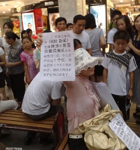帖子还上传了一张图片:一名女子头戴高檐帽子遮住鼻脸,坐在广州市北京路步行街一张长凳子上,右手对着镜头展开一张白纸,上称“广东电视台珠江频道《630新闻》主播徐洁是东莞市公安局局长多年被包的二奶,个人资产将近1个亿,现在已怀4个多月的女娃娃,纳税人的钱都被贪官们包二奶去了。”